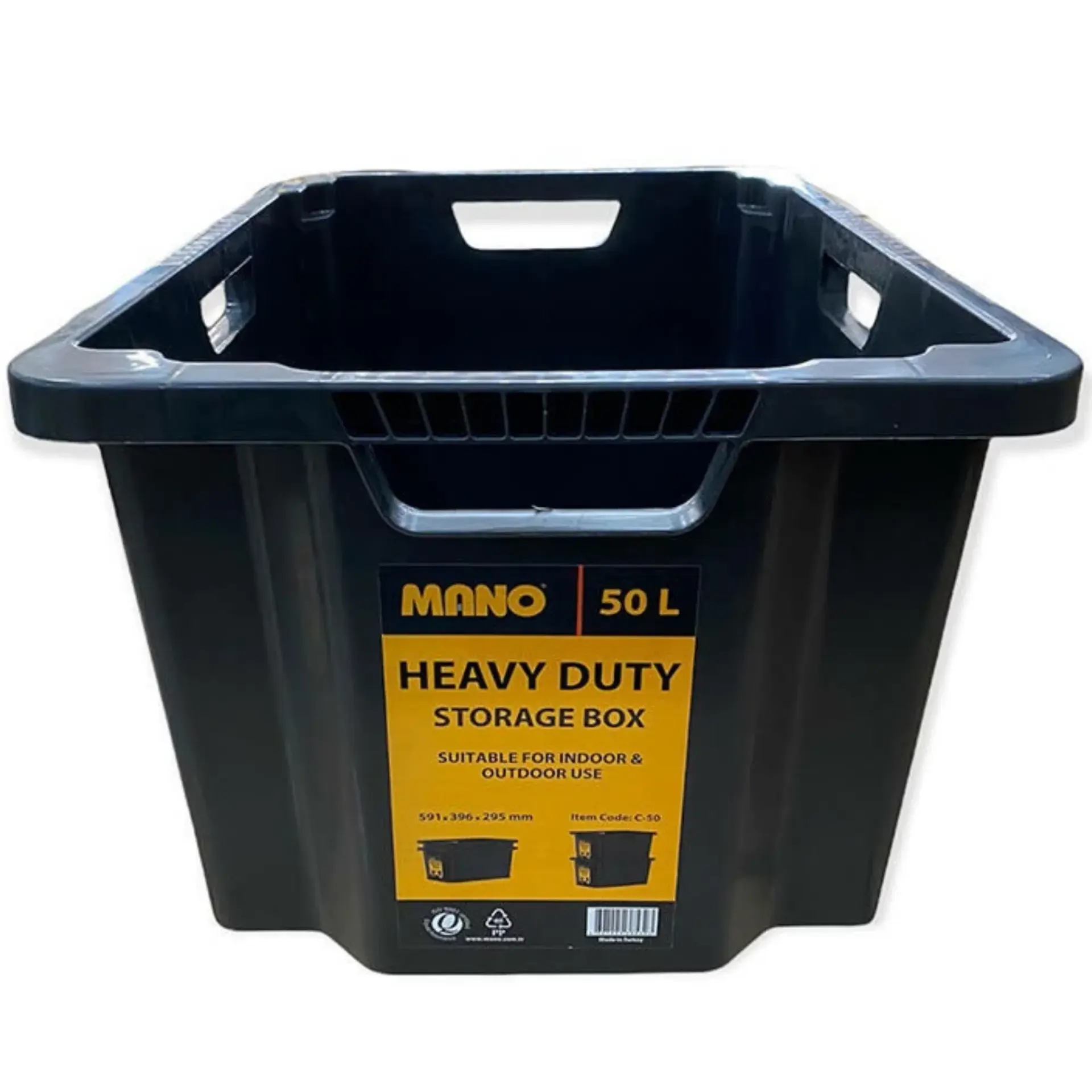 - Mano'nun 50 litrelik siyah kutusu çok dayanıklıdır ve geri dönüştürülmüş plastikten yapılmıştır.