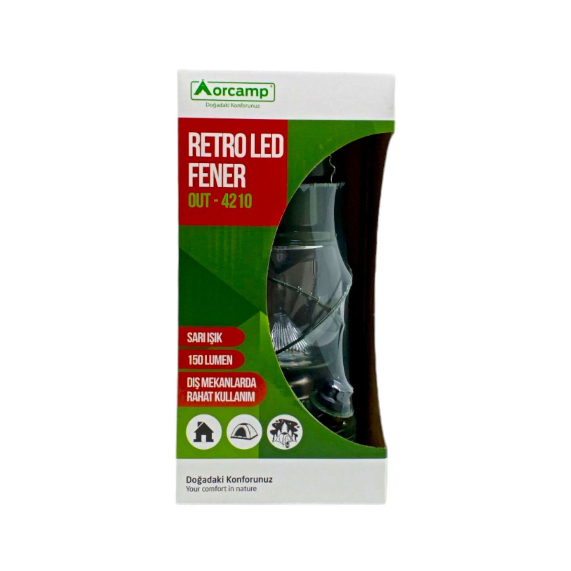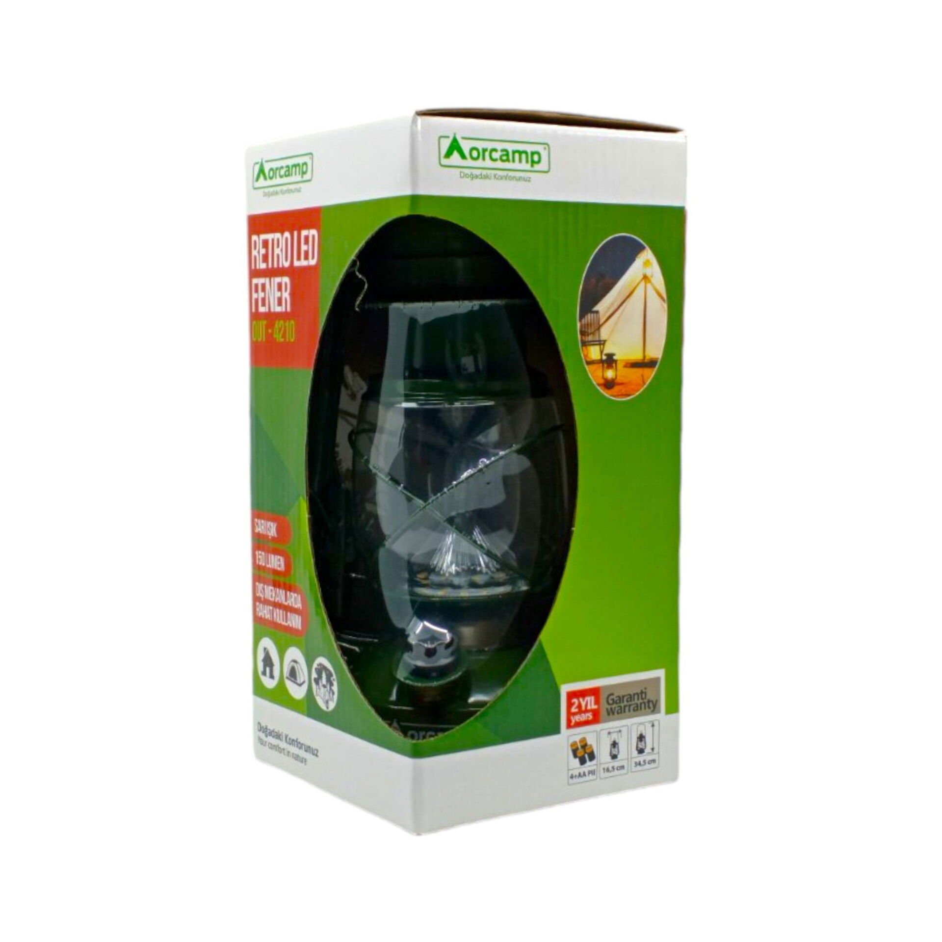 - Orcamp Retro fener, elektriksiz ortamda pille çalışma rahatlığı sağlar.